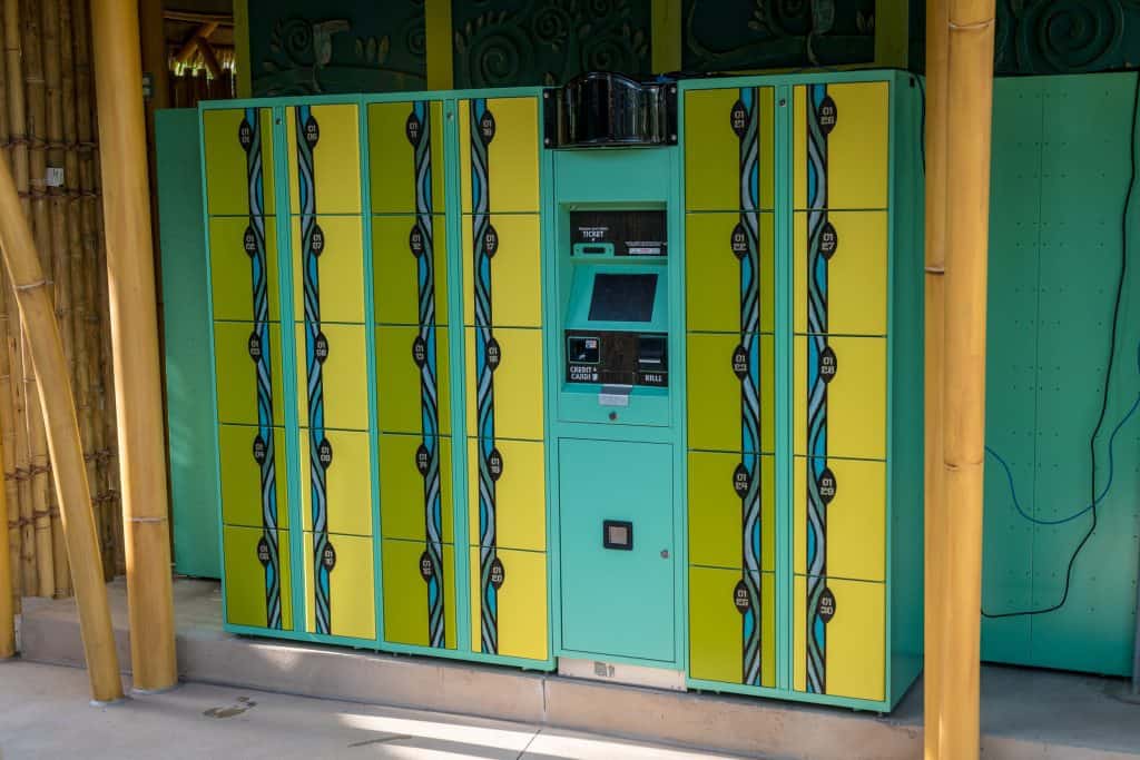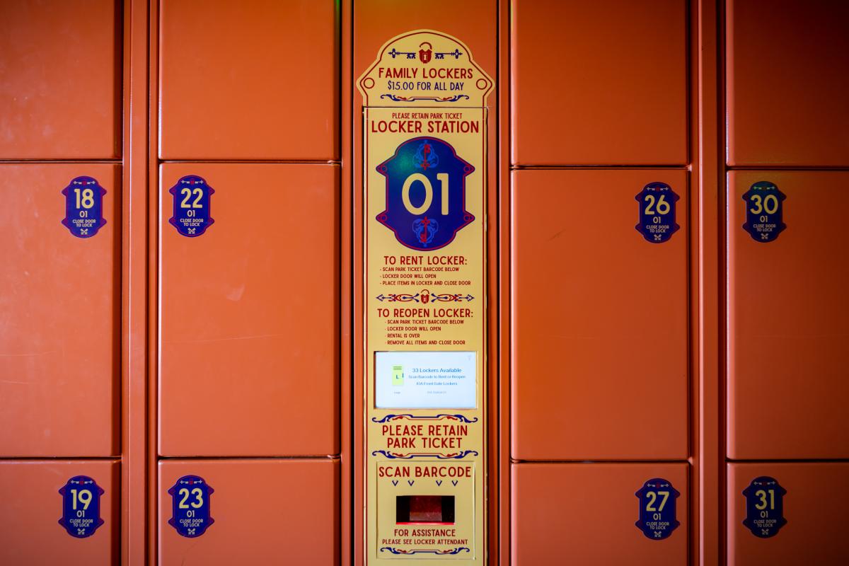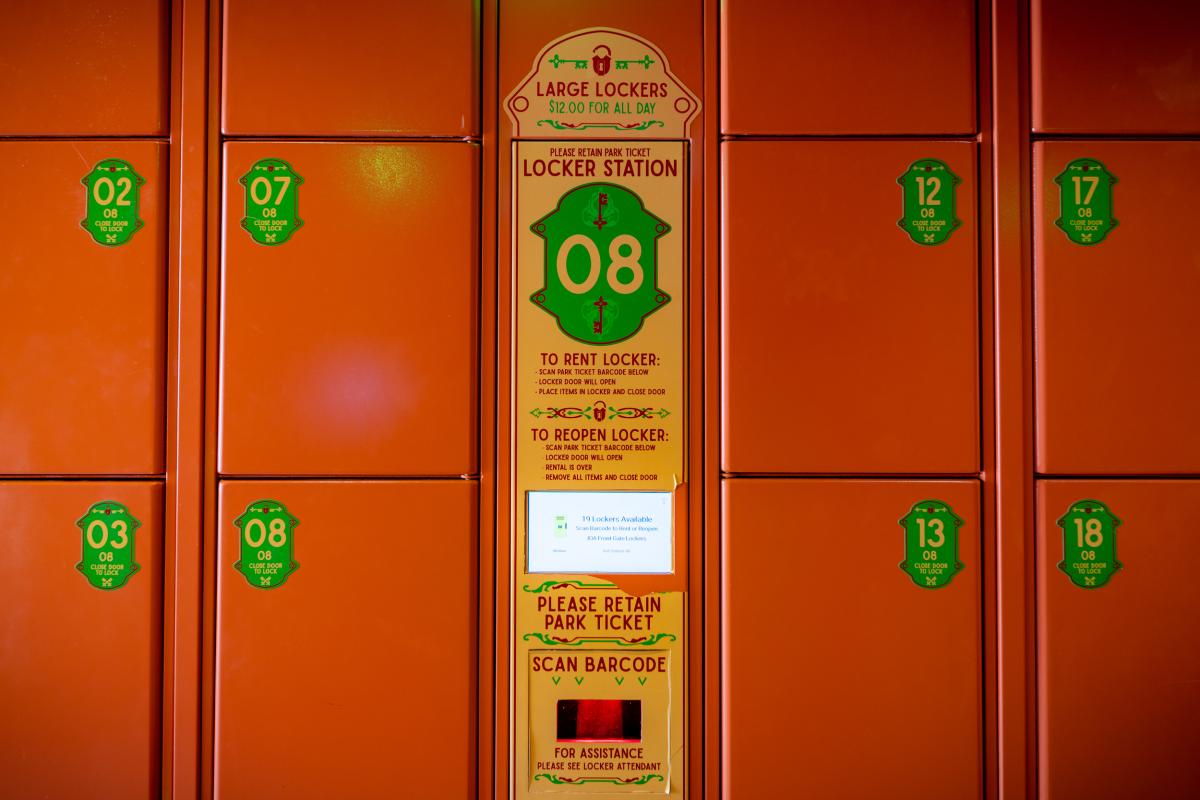 In any case, here is how it works: Each locker bank will have a light that indicates the locker availability in that area. Green indicates that there are plenty of lockers available, yellow means that the area has low availability for lockers, and red signifies that the locker area is full or closed. Once you find a locker bank with a yellow or green light, indicate the size locker you desire and scan your theme park ticket. Should you need to pay for a larger size locker, you will also need to enter a credit card as a form of payment. Once this is completed, your locker will open.
