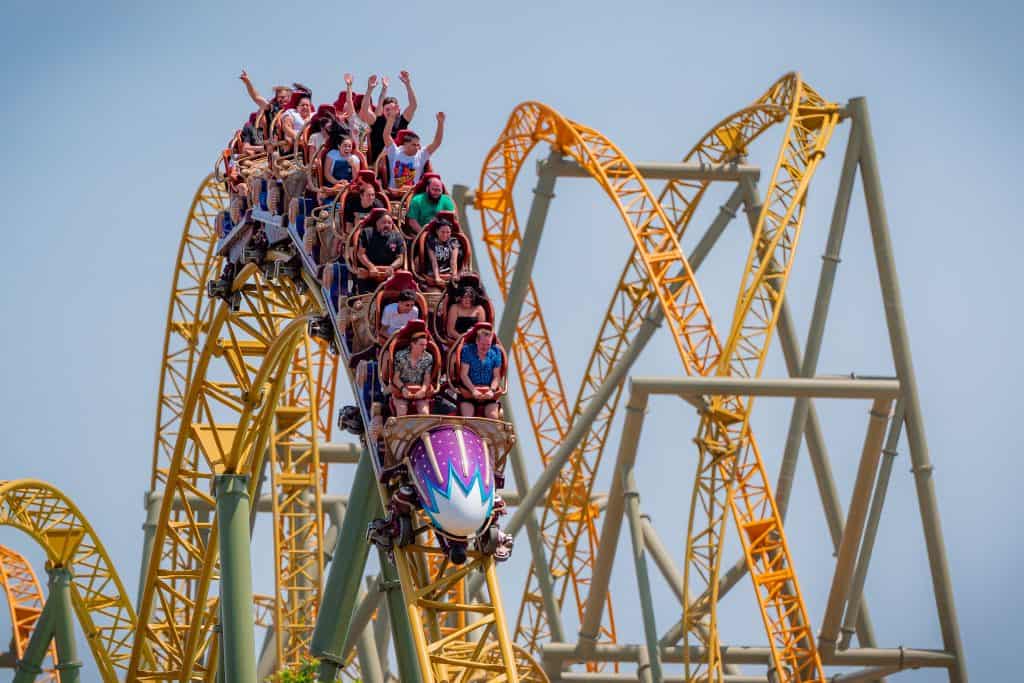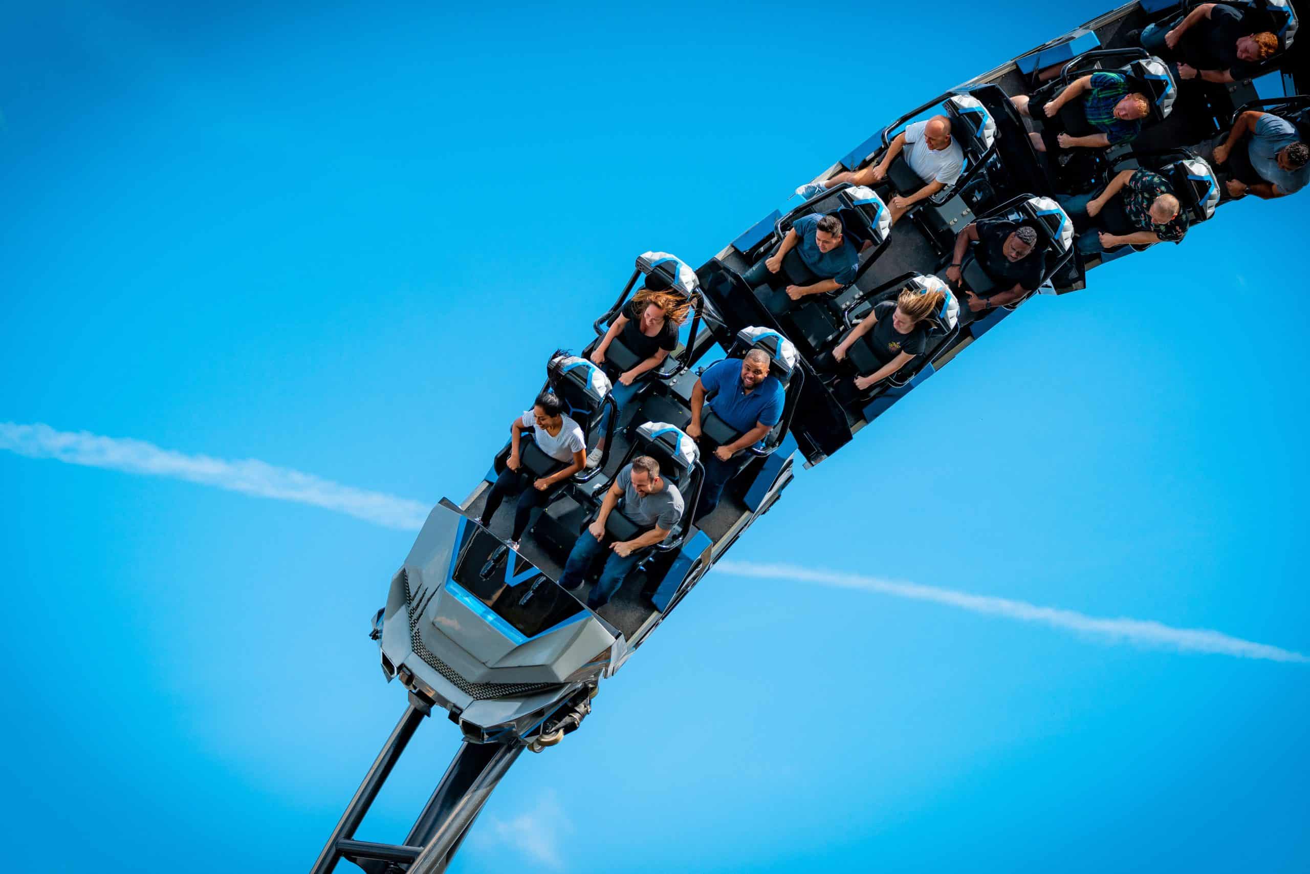 Where to sit: With two tracks, you’ll first choose between the yellow and green sides. Thrill-seekers often favor the green track for delivering a slightly more intense ride experience. After choosing your track, you’ll find two seats per row on each train. Want the best views of the park and the layout? Go for the front row. Want maximum airtime and whip-like forces? Head to the back row for an extra adrenaline kick. Test seats are available at the ride entrance, allowing guests to check comfort and fit before boarding.