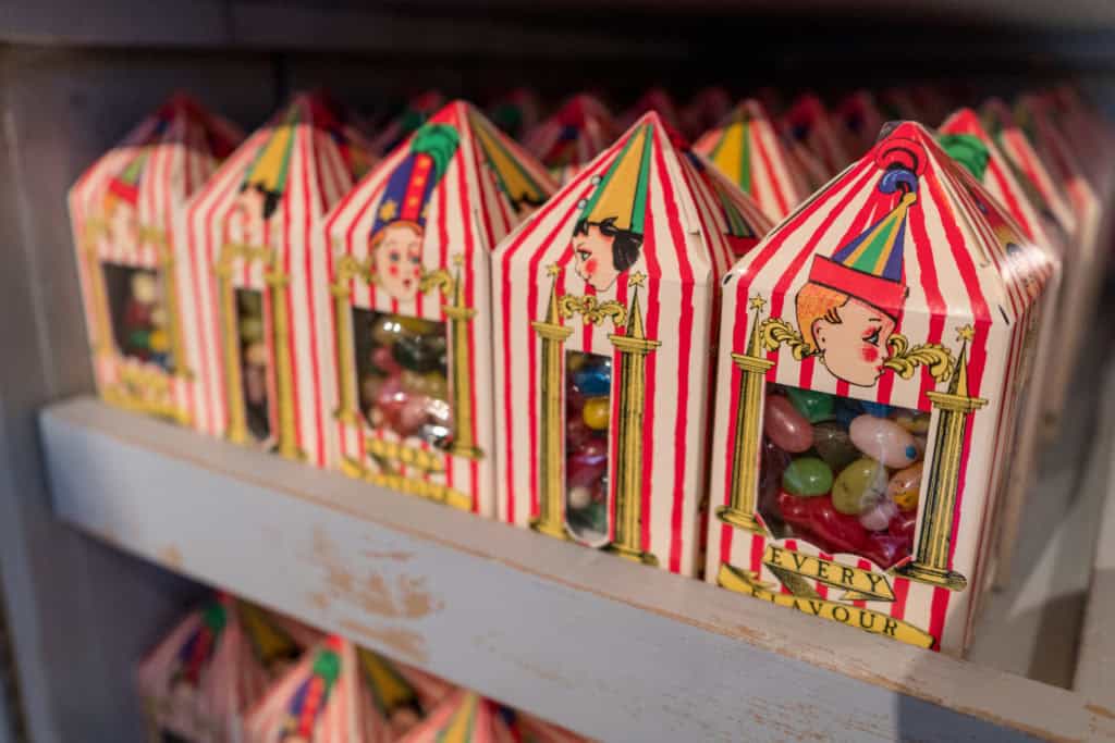 This shop carries a huge variety of Wizarding World confections, including Fudge Flies, Pepper Imps, Pink Coconut Ice, Fizzing Whizzbees, Exploding Bonbons, and Love Potions, to name a few. Near the register, you can choose from a number of bakery treats such as Cauldron Cakes, Pumpkin Pasties, Butterbeer Fudge, No-Melt Ice Cream, and caramel apples. Bulk candy – gummy worms, peach rings, licorice, etc. – is also available for purchase here. The following specialty bakery treats can be found close to the register: