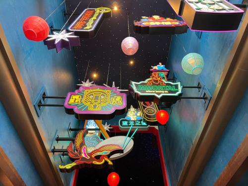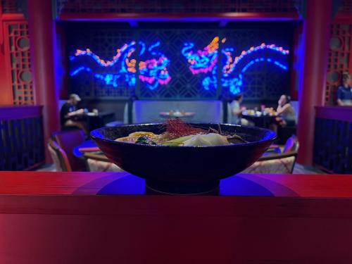 The Blue Dragon Pan-Asian Restaurant provides a unique culinary experience with Chinese, Japanese, and Thai cuisine. Set in the vibrant ambiance of a perpetual night market, it features a romantic lantern-lit patio. The decor features neon signs and moving lanterns, enhancing the immersive atmosphere.