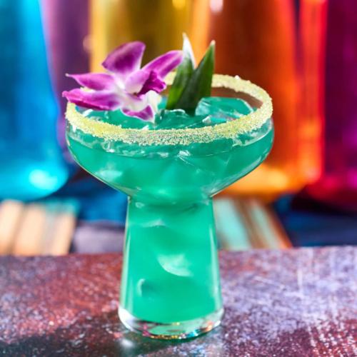 Ming River Sichuan Baiju, DeKuyper blue curaçao, BG Reynolds falernum, pineapple juice, white grapefruit juice, golden sugar rim with pineapple fronds and an edible orchid