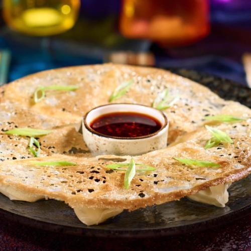 Lacy crust potstickers, dragon sauce