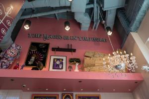 - Above the kitchen area, you’ll find a huge mural made entirely out of duct tape by artist Mona Superhero.